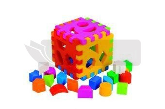 Kostka edukacyjna Wiki wykonana z przyjemnego w dotyku plastiku. W zestawie znajdują się specjalne klocki o różnych kształtach, które wkładane mogą być tylko w odpowiednie dla nich otwory.