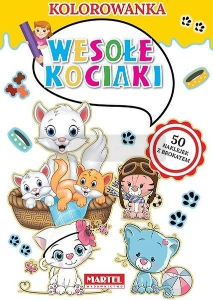 Wesołe kociaki to kolorowanka z ilustracjami sympatycznych kocich bohaterów Komety, Feliksa, Loli oraz innych niebanalnych łobuziaków. Książeczka zawiera 50 naklejek z brokatem.