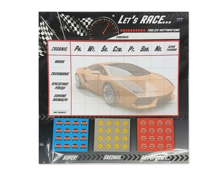 Tablica motywacyjna dla ucznia. Podział na dni tygodnia i zadania plus trzy rodzaje kolorowych karteczek z ocenami na super, średnio, do poprawy.