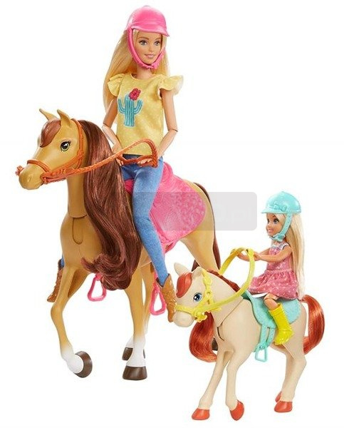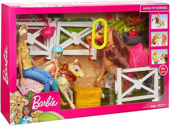Pomóż lalce Barbie i Chelsea opiekować się konikami! Miłośniczki zwierząt pokochają ten zestaw Barbie® z dużym konikiem, kucykiem, dwoma lalkami, szczeniaczkiem i akcesoriami. Oba koniki mają miękką grzywę i ogon, a także ruchomą głowę! Ponad 15 akcesoriów umożliwia zabawę w prawdziwą stadninę koni. Lalki mogą także wybrać się na przejażdżkę – każdy konik ma siodło i uzdę, a Barbie i Chelsea noszą kolorowe kaski dla bezpieczeństwa. W zestawie znajduje się także słodki piesek. Czas na wspaniałą zabawę w stadninie koni! Zawartość: 2 lalki, 2 konie, 1 kosz, 1 pęczek marchewek, 1 szczeniaczek, 1 bela siana, 2 kaski, 1 zestaw jabłek, 1 wiadro, 1 korytko, 1 szczotka, 1 butelka, 6 elementów ogrodzenia.