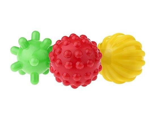 Zestaw trzech miękkich piłek sensorycznych przeznaczonych do ćwiczeń integracji sensorycznej oraz zabawy. Każda piłka posiada inny rozmiar i inną fakturę, dzięki czemu dostarcza różnych wrażeń czuciowych.