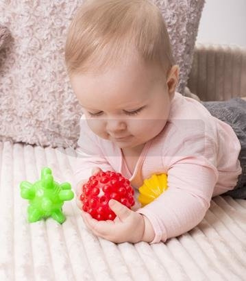 sprawdzają się również w okresie ząbkowania, ponieważ faktury piłek masują dziąsła;