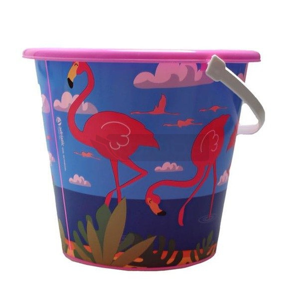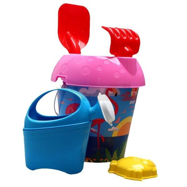 Zestaw wiaderko z lodami. Idealne sprawdzi się w piękne, słoneczne dni lata w piaskownicy czy na plaży, jak i w domu w połączeniu z piaskiem kinetycznym, kiedy pogoda za oknem jest pochmurna i deszczowa. Zestaw zawiera łopatkę ,grabki, foremke w kształcie ryby , sitko oraz wiaderko ozdobione flamingami. Wymiary foremki : 9 cm. Wymiary łopatki: 24,5 cm. Wysokość wiaderka: ok. 15,5 cm. Wymiary grabi: 21 cm. Wysokość konewki: 14 cm. Średnica sitka: 24 cm