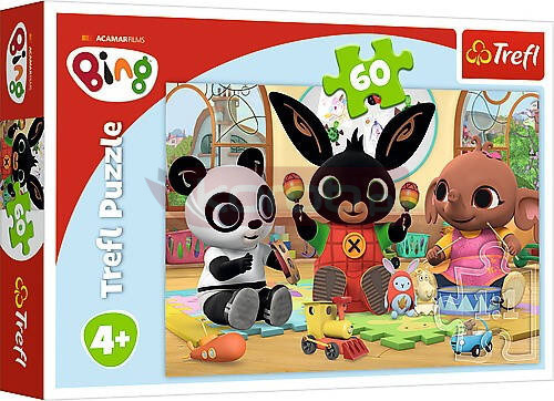 Puzzle 60 elementów przedstawiające bohaterów bajki "Bing". Po ułożeniu powstanie obrazek o wymiarach 33x22 cm. Wysoką jakość, nasycenie kolorów i bezpieczeństwo układania zapewnia kalandrowany papier odbijający światło i wykorzystanie materiałów ekologicznych.