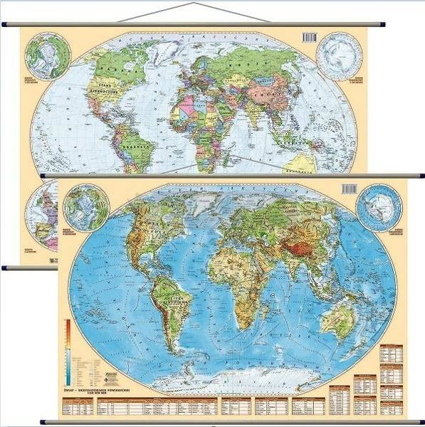 Po jednej stronie mapa ukazuje ukształtowanie powierzchni Świata w skali 1:60 000 000 oraz oba bieguny w skali 1:102 000 000. Dodatkowo mapa zawiera tabele z najważniejszymi informacjami dotyczącymi oceanów, poszczególnych kontynentów, oraz największych wysp, półwyspów, pustyń, szczytów górskich, jezior, rzek i wodospadów.
