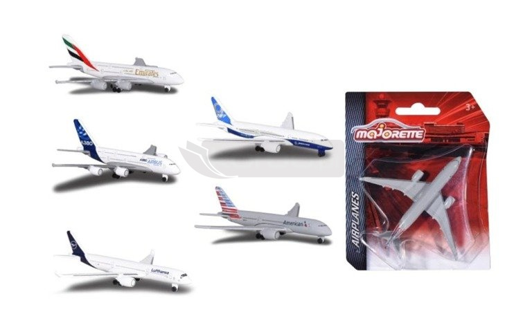 Metalowo plastikowe modele samolotów pasażerskich cenionej marki Majorette. 5 różnych wzorów, towar wysyłany losowo.