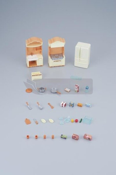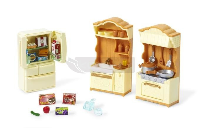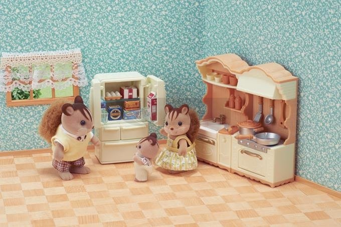 Kuchnia Sylvanian Families w stylu wiejskim z lodówką to obowiązkowe wyposażenie każdego domku dla lalek. Dwie szafki można ustawić obok siebie jako ciąg roboczy. Na kuchence oraz w piekarniku rodzina zwierzątek przygotuje najpyszniejsze potrawy. W lodówce można znaleźć wszystko, co jest potrzebne do przygotowania posiłku. Po jedzeniu wszystkie brudne naczynia trafią do zlewu, a po umyciu na półki. Zestaw mebelków składa się z 30 elementów i zawiera szafkę ze zlewem i półkami, szafkę z kuchenką i piekarnikiem, lodówkę z 5 ruchomymi drzwiczkami i wiele akcesoriów kuchennych.