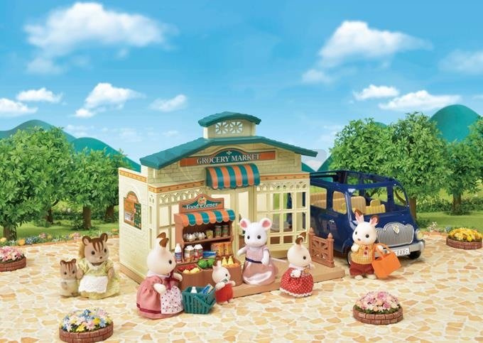Supermarket Sylvanian Families to największy sklep samoobsługowy w całej wiosce Sylvanian Village. Tu można kupić wszystko, czego potrzeba na co dzień. Na sklepowych półkach znajdziesz owoce, warzywa, jajka, mleko i inne artykuły spożywcze. Na zakupy zwierzątka mogą się wybrać ze specjalną torbą lub koszykiem. Po wybraniu produktów trzeba je położyć na taśmie przy kasie. Taśma jest ruchoma i zakupy wpadają bezpośrednio do torby. Supermarket można ustawiać na podstawce w różnych położeniach i samodzielnie zadecydować, czy potrzeba więcej miejsca w sklepie, czy też przed nim. Drzwi wejściowe są ruchome. Zestaw „Supermarket” Sylvanian Families składa się z 35 elementów i zawiera budynek, regały, kasę z taśmą do przemieszczania zakupów, 2 kosze na zakupy i wiele artykułów spożywczych.