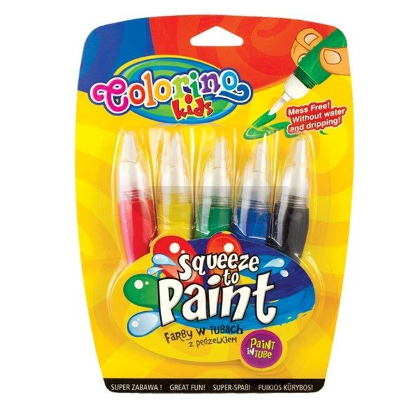Farby w tubach z pędzelkami w 5 podstawowych kolorach. Wystarczy nacisnąć i już można malować. Nie potrzeba żadnych dodatkowych akcesoriów ani wody! Każda farbka zamknięta jest w wygodnej plastikowej tubie zakończonej pędzelkiem z włosia, który zapewnia wysoką precyzję w wykonywaniu prac. Idealne dla małych artystów. Bez wody, bez kapania, bez bałaganu!