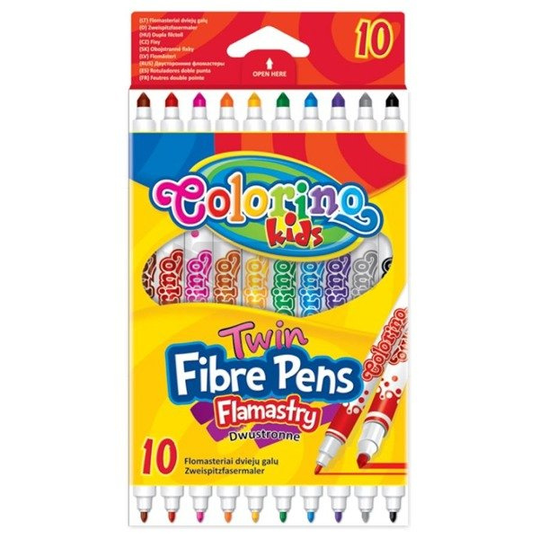 Dwustronne flamastry w 10 kolorach. Dwie końcówki flamastra przeznaczone do różnych zadań: stożkowa końcówka pozwala rysować linie o dwóch grubościach: 1 lub 4 mm, cienka końcówka o grubości 0,7 mm świetnie nadaje się do pisania lub rysowania precyzyjnych kształtów. Flamastry umieszczone są w plastikowej podstawce ułatwiającej przechowywanie.