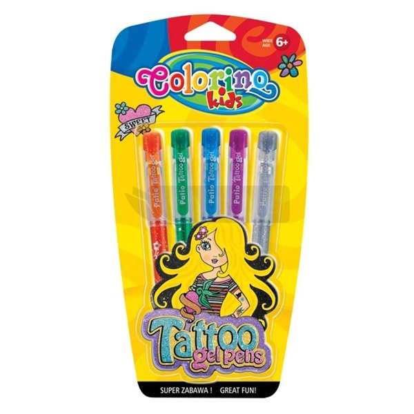 Długopisy żelowe do wykonywania tatuaży. W zestawie szablony. Idealne na przyjęcia urodzinowe, dyskoteki, zabawy sportowe. Dla dzieci powyżej 6 lat. Zmywalny za pomocą wody i mydła.