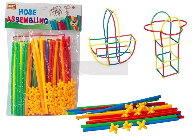 Klocki - patyczki, które za pomocą krzyżaków, można łączyć w różne figury. 110 elementów w różnych kolorach. Patyk-słomka o wymiarach 19x0.5 cmWiek: 3+ Wymiary opakowania: 20x4x28 cm