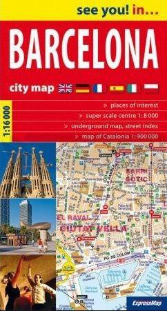 Barcelona plan miasta 1:16 000. Szczegółowa skala 1:16 000 (1 cm - 160 m), bogata treść turystyczna, m.in.: zabytki, muzea, hotele, schroniska młodzieżowe i inne istotne obiekty, linie i stacje metra, linie tramwajowe, linie autobusów turystycznych, cieniowanie plastycznie pokazujące ukształtowanie terenu, schemat metra, plan centrum Barcelony w bardziej szczegółowej skali 1:8 000 (1 cm - 80 m), mapa samochodowa Katalonii w skali 1:900 000, skorowidz ulic.