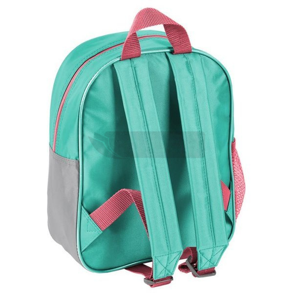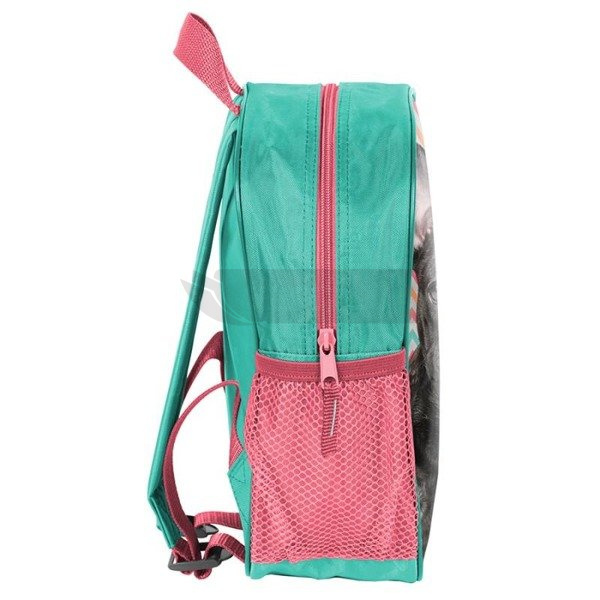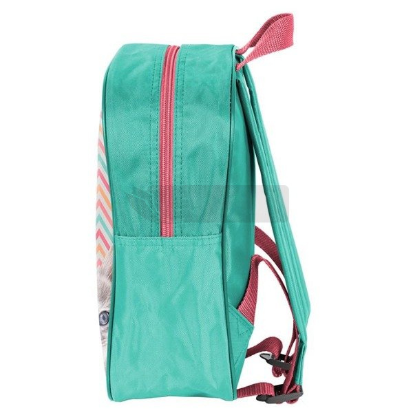 Mały plecak przedszkolny, jedna komora, jedna boczna kieszeń z siatki (mieści małą butelkę, bidon lub termos). Regulowane szelki, wygodny uchwyt do przenoszenia.