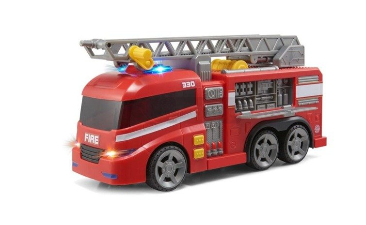 Duży samochód straży pożarnej, stylizowany na pełnowymiarowy pojazd. Zabawka posiada ruchomą drabinę do ręcznego obracania oraz otwierany bok. Samochód wyposażony jest również w realistyczne dźwięki i migające światełka, a uruchamia się je poprzez naciśnięcie przycisków umieszczonych na górze pojazdu.