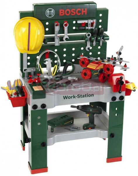 Wspaniały zestaw dla młodego majsterkowicza to zabawkowa kopia prawdziwych narzędzi Bosch stworzona przez firmę Theo Klein. Komplet składa się ze 150 elementów, takich jak: wkrętarka akumulatorowa, piła, młotek, zacisk, pilniki, klucze, obcęgi , śruby oraz solidny stojak do powieszenia wszystkiego. Zabawki są wykonane z plastiku najwyższej jakości, który gwarantuje ich wytrzymałość. Zabawa przy użyciu tego sprzętu rozwinie kreatywność dziecka i zapewni rozrywki przez wiele godzin.