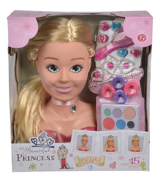 Głowa z długimi blond włosami i licznymi akcesoriami do czesania i upinania włosów oraz wykonywania makijażu, dołączona tiara, 15 elementów, wysokość: 26 cm