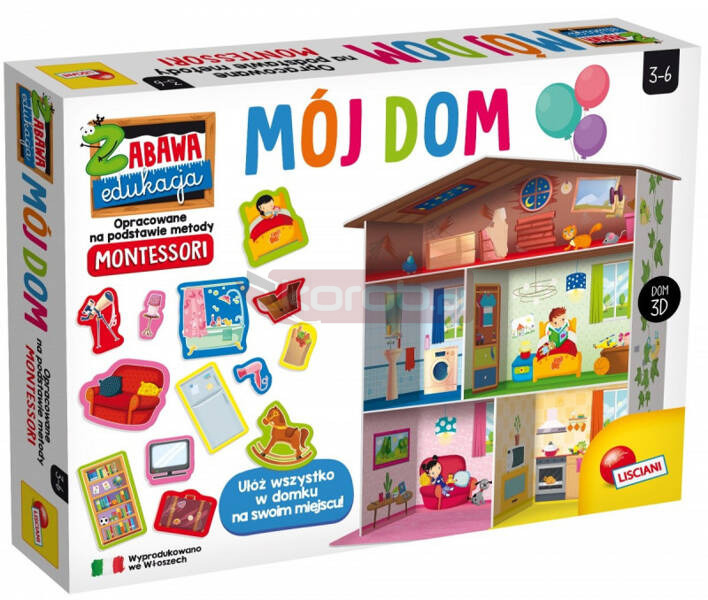 Gra Mój dom polega na dopasowaniu elementów domu do odpowiedniego pokoju. Dla ułatwienia, dany element ma kolor pomieszczenia, w którym powinien zostać umieszczony. Z tego powodu wanna ma kolor niebieski, jak podłoga w łazience, a łóżko jest zielone, tak samo jak podłoga w sypialni. Zestaw oparty jest na metodzie edukacyjnej włoskiej psycholożki - Marii Montessori. Zabawa i edukacja to nowa seria edukacyjna, która pozwala dzieciom na poznawanie określonych obszarów i zdobywanie istotnych kompetencji, które są istotne w późniejszych etapach życia. Światowa Organizacja Zdrowia wyodrębniła 10 umiejętności życiowych, które są potrzebne by wyrosnąć na lepszą i szczęśliwszą osobę, która jest w stanie prowadzić godne życie. I to właśnie te umiejętności są rozwijane w grach z tej serii, które są również dla dziecka świetną zabawą.