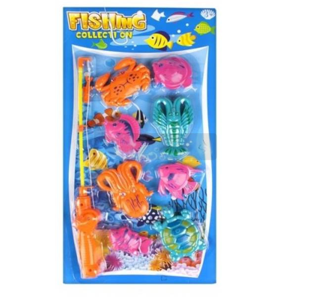 W zestawie znajdują się wędka oraz 4 rybki i żółw wodny. Wszystkie zwierzątka wodne posiadają magnes, dzięki którym łatwo złowić je na wędkę która również posiada magnes. Produkty wykonane z plastiku.