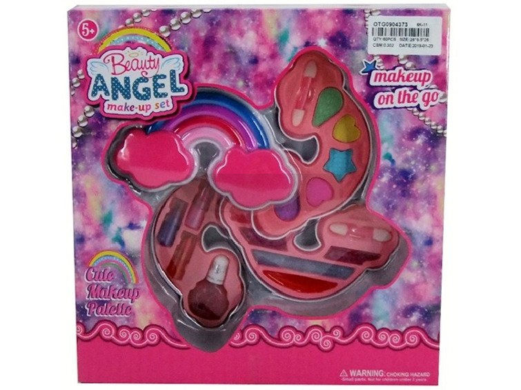 Zestaw kosmetyków dla lalki zawiera: pojemnik w kształcie Tęczy z 3 wysuwanymi paletkami, 5 cieni, 5 błyszczyków z brokatem, lakier, 3 pomadki, 2 szpatułki, 2 spinki.
