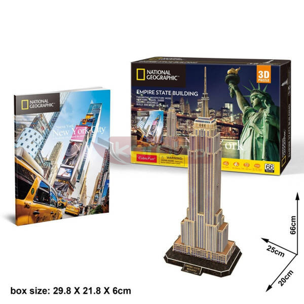 Puzzle Empire State Building na licencji National Geographic. W opakowaniu znajduje się 66 puzzli, wykonanych ze specjalnego materiału przypominającego piankę. Puzzle są ponumerowane, ponacinane i umieszczone na arkuszach. Wystarczy bez użycia siły wycisnąć element z arkusza i zmontować go zgodnie z dołączoną instrukcją, bez użycia kleju ani specjalnych narzędzi. Poza puzzlami w opakowaniu znajduje się praktyczny przewodnik z ciekawostkami zawierający 28 stron.
