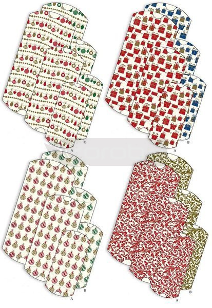 Zestaw świątecznych pudełek prezentowych w trzech różnych rozmiarach: 8x12 cm, 10x17 cm, 13x21 cm. Gramatura papieru 270gr/m2. Mix wzorów, wzór wysyłany losowo.