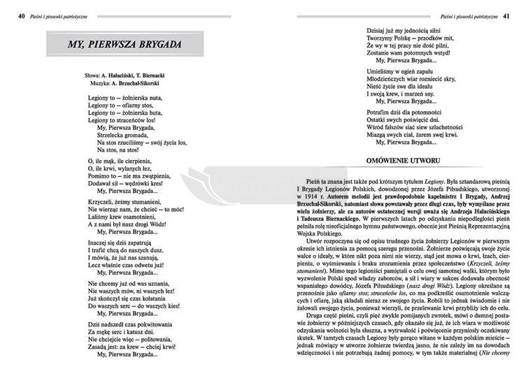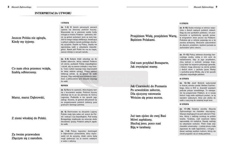 Mazurek... został omówiony wers po wersie, przedstawiono też jego historię, okoliczności powstania i kontekst historyczny, natomiast znaczki pewniak na teście wskazują wiadomości niezbędne na sprawdzianach. Również pozostałe utwory posiadają dokładne, odpowiadające wymaganiom uczniów szkoły podstawowej opracowania.