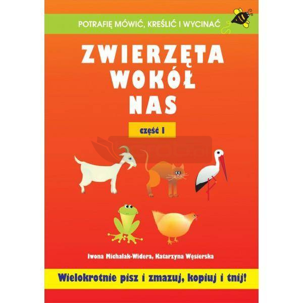 Książeczka Zwierzęta wokół nas przeznaczona jest dla dzieci, które z różnych powodów nie zaczęły jeszcze mówić. Proponujemy ją także maluchom, które nie potrafią, choć robią to już ich rówieśnicy, kreślić linii lub wycinać, trzymając prawidłowo przeznaczone do tego przybory. Książeczka ułatwi małemu dziecku opanowanie mowy oraz umiejętności, które znakomicie przygotowują dziecko do pisania. W zabawie celowo wykorzystaliśmy onomatopeje. Wyrazy dzwiękonaśladowcze to łatwe do wymawiania sylaby i zbitki głosek, to jedne z pierwszych słów wypowiadanych przez dzieci na całym świecie.