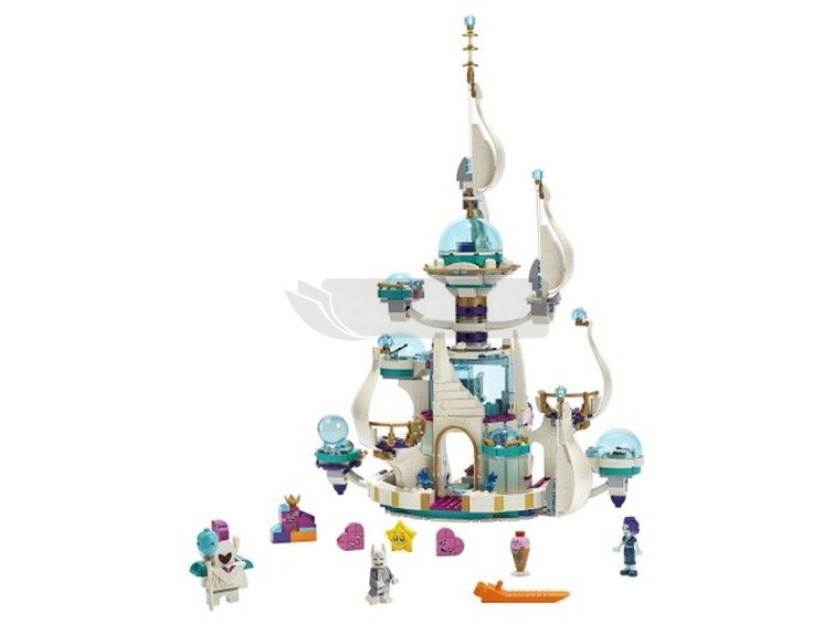W zestawie 70838 Pałac Królowej Wisimi na dzieci czeka mnóstwo kosmicznych przygód i możliwości wcielenia się w ulubione postacie z filmu LEGO® PRZYGODA 2™. Ten kolorowy pałac LEGO ma na szczycie obrotową część z otwieraną i odczepianą rakietą dla Królowej Wisimi, odczepiane kapsuły dla innych postaci, pokój strażnika, szczegółową jadalnię oraz stanowisko DJ-a do kreatywnej zabawy. Ten zestaw do budowania to świetna propozycja dla wszystkich fanów filmu LEGO PRZYGODA 2, którzy chcą na nowo przeżyć ulubione sceny lub wymyślić własne historie z udziałem minifigurki, minilaleczki oraz sześciu figurek zbudowanych z klocków. • W zestawie z pałacem LEGO® znajduje się osiem postaci z filmu LEGO PRZYGODA 2™: minifigurka Batmana kawalera™, minilaleczka Celesty oraz zbudowane z klocków figurki Królowej Wisimi powiewa, Wafla-Wafla, Gwiazdki, królewskiego strażnika i dwóch Serduszek. • Wielopiętrowy pałac ma na szczycie obrotową część z otwieraną i odczepianą rakietą dla Królowej Wisimi, a także odczepiane kapsuły dla innych postaci, dwa balkony, pokój strażnika i jadalnię. W pokoju strażnika znajduje się zbudowany z klocków ekran monitoringu oraz różne akcesoria, takie jak kubek kawy, małe serduszko i pączek. W jadalni natomiast znajdziesz stół, dwa krzesła, kredens, blender do koktajli zbudowany z klocków, różne potrawy i napoje oraz stanowisko DJ-a. • W komplecie jest również złożony z klocków lizak królewskiego strażnika. • Minifigurka Batmana kawalera™ (ze specjalnym nadrukiem garnituru), minilaleczka Celesty oraz figurki Królowej Wisimi I powiewa (mała wersja), Wafla-Wafla (mała wersja) i królewskiego strażnika to nowości na maj 2019 r. • Ten fantastyczny zestaw konstrukcyjny z pałacem pozwoli dzieciom odtworzyć zabawne sceny z filmu LEGO® PRZYGODA 2™. • Zabawkowy pałac ma ok. 48 cm wysokości, 34 cm szerokości i 18 cm głębokości.