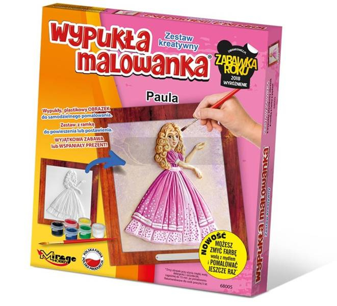 Wypukła Malowanka od Mirage Hobby to Zestaw Kreatywny dla osób powyżej 5. roku życia. Zestaw zawiera wypukły, plastikowy, kształtny obrazek, farbki akrylowe, pędzelek oraz ramkę z kartonu do postawienia lub powieszenia. Zmyj obrazek przy użyciu ciepłej wody, mydła i szczoteczki, najpóźniej do 15 min. po pomalowaniu. Obrazek ma odpowiedni do wzoru wypukły kształt, który jest dobrze odczuwalny w dotyku. Produkt jest wymyślony i wyprodukowany w Polsce! Wszelkie prawa zastrzeżone. Każda Wypukła Malowanka to konkretny wzór z danej serii. Kolekcja jest podzielona na różne serie np. Koty, Psy, Konie, Futrzaki, Dinozaury, Jednorożce, Kwiaty, Sport, Bajki, Zoo i inne. Seria Wypukła Malowanka Zestaw Kreatywny została nagrodzona Wyróżnieniem Zabawka Roku 2018.