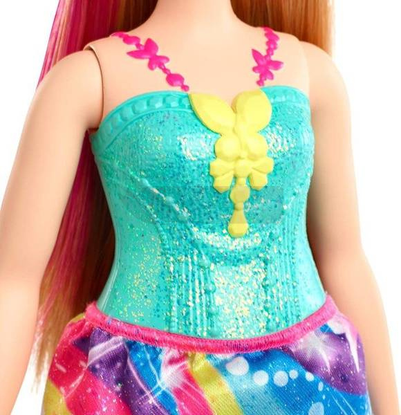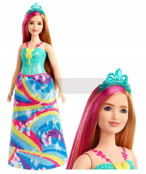 Lalka Barbie Dreamtopia Księżniczka to fantastyczna zabawka, która pozwoli miłośniczkom baśni bawić się na wiele sposobów! Lalki księżniczki Barbie Dreamtopia inspirują królewskie przygody w bajkowych modzie! Ta lalka księżniczki od Barbie Dreamtopia ma na sobie lśniący stanik i kolorową spódnicę z tęczowym nadrukiem. Niebieska tiara i dopasowane buty dopełniają jej fantastycznego wyglądu. Różowa smuga w długich truskawkowych blond włosach lalki Barbie dodaje kolejny akcent kolorystyczny. Lalki i zabawki Barbie Dreamtopia stanowią idealny prezent dla miłośników bajek w wieku od 3 do 7 lat. Dzieci mogą zbierać wszystkie lalki i zabawki Dreamtopia, aby ich zabawa była jeszcze wspanialsza