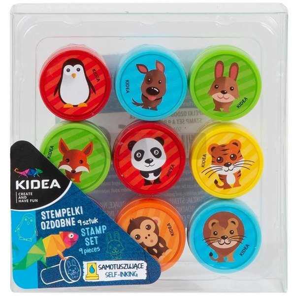Stempelki w wygodnym plastikowym pudełeczku, w nowych wzorach ze zwierzątkami: lama, kangur, tygrys, koala, wielbłąd, zebra, delfin, koń i pies. Są samotuszujące, więc nie wymagają używania dodatkowej poduszki z tuszem.
