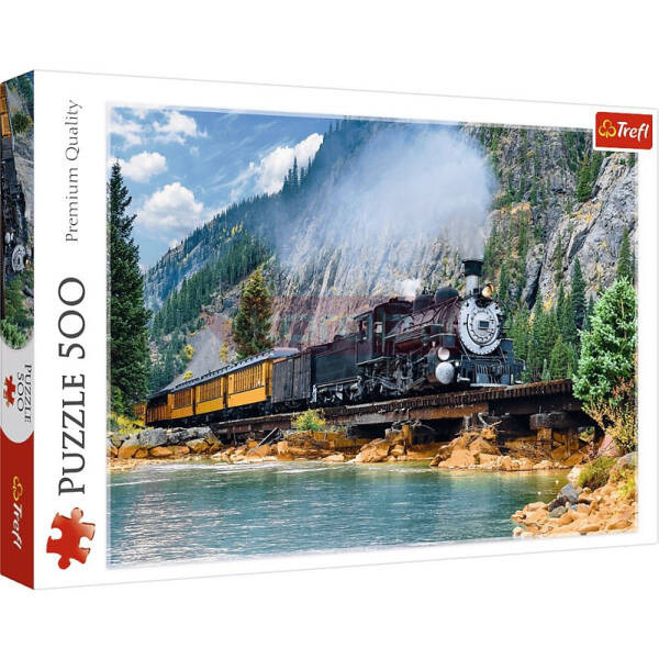 - Górski pociąg to puzzle 500 elementów przedstawiające wspaniały pociąg parowy na tle pięknego, górskiego krajobrazu.