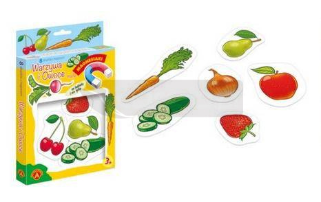 Magnesiaki Małe Warzywa i Owoce to zestaw tematycznych obrazków, powleczonych magnetyczną folią na odwrocie. Dzięki temu obrazki można układać nie tylko na stole lub podłodze, można je również ustawiać na pionowej ścianie lodówki lub innych metalowych płaszczyznach. Serię wyróżnia przede wszystkim bardzo ładna grafika, duże rozmiary, oraz gruba tektura, pozwalająca dzieciom na łatwy chwyt. Strona z obrazkiem powleczona została folią, aby łatwo było je czyścić.