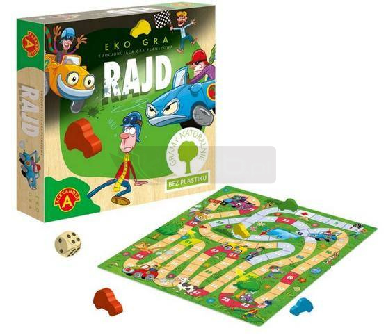 Eko Gra Rajd to emocjonująca gra typu wyścig w której gracze próbują jak najszybciej dotrzeć do mety. Liczba oczek wyrzuconych na kostce wskazuje o ile pól należy przesunąć pionki po torze. W trakcie rajdu po planszy każdego z graczy będą spotykały miłe lub przykre niespodzianki, kary i nagrody. Produkt nie zawiera plastiku. Wykonane z drewna kolorowe pionki w kształcie autek oraz kostka. Elementy drewniane barwione bezpiecznymi farbami wodnymi. Niefoliowana plansza oraz pudełko. Papierowa wypraska. Papier oraz drewno użyte w produkcji gry pochodzą ze sprawdzonych źródeł, które prowadzą zrównoważaną gospodarkę leśną, nie przyczyniając się tym samy do spadku ilości drzew w środowisku.