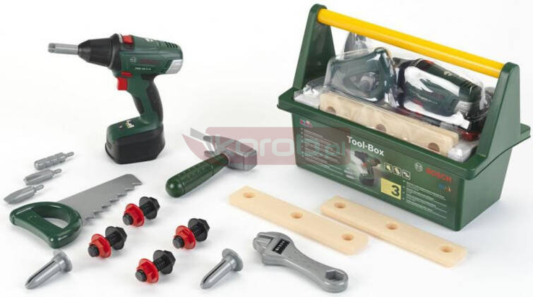 Skrzynka narzędziowa Bosch II z wiertarkąZestaw zabawkowych narzędzi, składający się z 15 elementów umieszczonych w poręcznej skrzynce, od Kleina na licencji Bosch.
