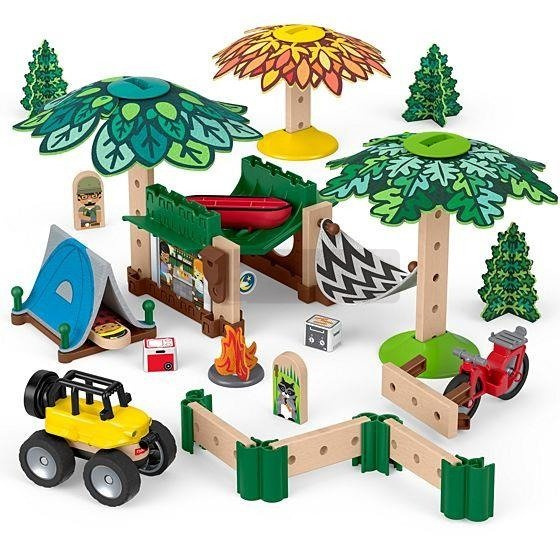Dzięki temu zestawowi konstrukcyjnemu z linii Wonder Makers™ przedszkolaki mogą zbudować własne wymarzone miejsce na kemping: z drzewami, hamakiem, kajakiem, ogniskiem i innymi akcesoriami! Dzieci mogą za pomocą ponad 60 wielofunkcyjnych elementów konstruować różne wersje kempingów – z tych samych elementów da się stworzyć mnóstwo kombinacji. Opcji jest tak wiele, że za każdym razem może powstać zupełnie inny kemping! Zabawa, która rozwija. Kreatywność i wyobraźnia: dzieci rozwijają swoją kreatywność, odgrywając historyjki za pomocą figurek i budując własny kemping. Projektowanie i budowanie: przedszkolaki ćwiczą umiejętność projektowania i budowania, wznosząc coraz to inne wersje kempingu i łącząc elementy zestawu w różnych konfiguracjach! • Z tym zestawem do zabawy Wonder Makers™ Zaciszny kemping od Fisher-Price® dzieci (w wieku powyżej 3 lat) mogą projektować i budować, a także wymyślać własne przygody! • Ponad 60 elementów, w tym drzewa, namiot, pojazd, „postacie”, drewniane części i nie tylko • Tych samych elementów można użyć do tworzenia torów i budynków! • Budowanie na różne sposoby: zgodnie z instrukcjami zawartymi w dołączonym do zestawu Przewodniku małego konstruktora albo realizowanie własnych pomysłów! • Zbierz pozostałe pojazdy, zestawy konstrukcyjne i tory, aby poszerzać swój świat Wonder Makers™! (Sprzedawane oddzielnie w zależności od dostępności)