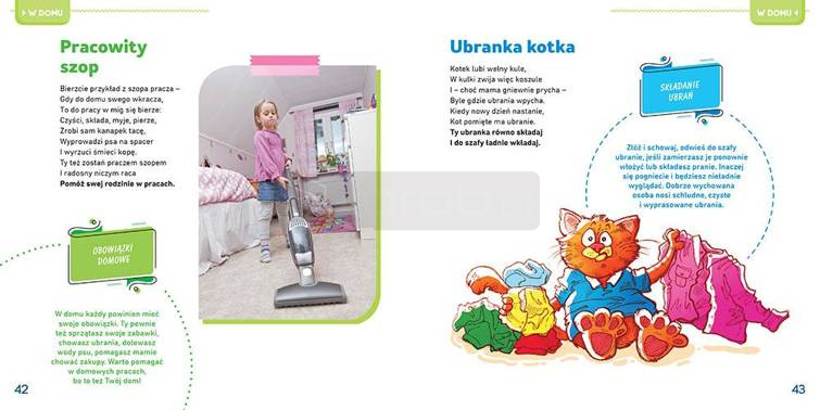 Każdemu wierszykowi towarzyszy kolorowa ilustracja lub zdjęcie oraz komentarz z dodatkowym wyjaśnieniem - nie tylko, jak się zachowywać, ale również dlaczego. Może on stanowić cenną pomoc albo stać się punktem wyjścia do ciekawych rozmów z dzieckiem.