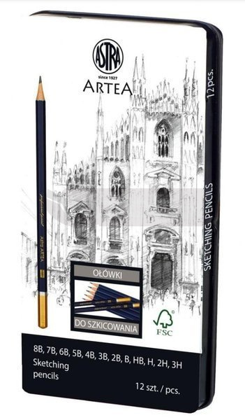 W opakowaniu ołówki o twardości: 8B, 7B, 6B, 5B, 4B, 3B, 2B, B, HB, H, 2H, 3H.
