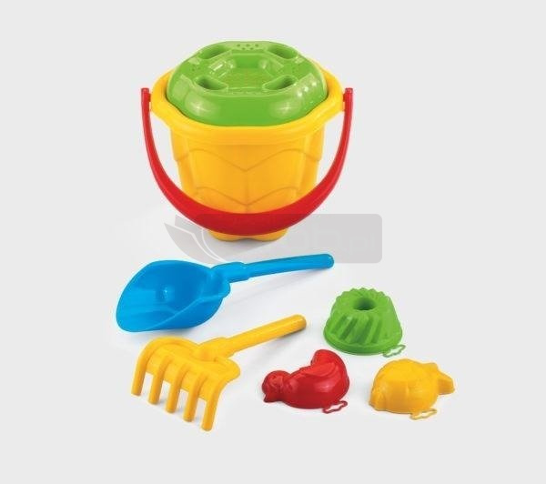 Zestaw zawiera 7 elementów: wiaderko, sitko, grabki, łopatkę, 3x foremki.