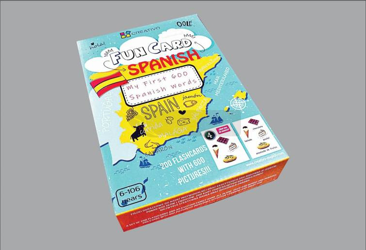 Zestaw zawiera 200 kart obrazkowych zawierających 600 podstawowych słów. Doskonała zabawa oraz idealna pomoc dla osób zaczynających swoją przygodę z językiem hiszpańskim. Dla uczniów na nieco wyższym poziomie możemy ustalić dodatkowe zadanie, np. ułożenie zdania (lub zadanie pytania kolejnemu graczowi) z danym słowem z użyciem czasu, który akurat chcemy przećwiczyć. Zestaw składa się z 400 rzeczowników, 100 czasowników, oraz 100 przymiotników.