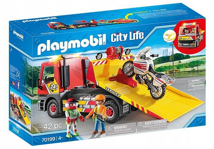 Motor ma wadę i znajduje się przy głównej drodze. Wymagane jest użycie PLAYMOBIL® Pomoc drogowa. Pomocnik szybko wskakuje do kabiny i jedzie po motor. Nawet z daleka widzi Motocyklistę który macha przy drodze. Najwyraźniej motor się popsuł. Nie ma problemu z samochodem pomocy drogowej. Dzięki specjalnie przygotowanemu samochodowi pomocy drogowej motocykl można łatwo wciągnąć na rampę i zamocować aby stał. Teraz szybko zawozi motocykl do naprawy do warsztatu. W nowym, fajnym świecie PLAYMOBIL® z praktycznymi i wszechstronnymi pojazdami i budynkami wszystko kręci się wokół ruchu ulicznego. Zestaw zawiera dwie figurki Playmobil, lawetę z migającym światłem, wciągarki i rampy składane, motocykl i wiele innych dodatków. Laweta z migającym światłem (w zestawie baterie) jest używana przez całą dobę. Zaw. Motocykl. Wymiary lawety: 32 x 13 x 15 cm (dł. X szer. X wys.).