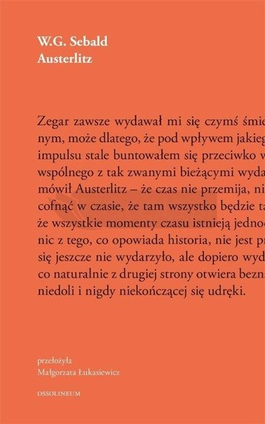 Austerlitz to powieść na wskroś aktualna, ze zdwojoną siłą przypominająca wydarzenia, które zbyt łatwo ulatują z pamięci ludzkości. Mimo że w książce tej wszystko wydaje się nadzwyczaj zrozumiałe, przejrzysta proza Sebalda kluczy i zwodzi, odkrywając coraz to nowe światy: te rzeczywiste i te wyobrażone.