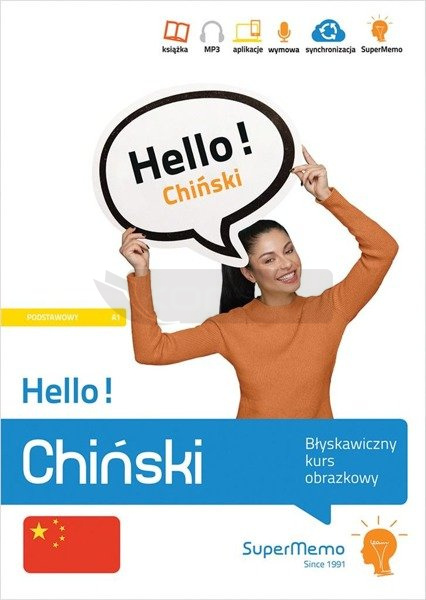 Hello! Chiński to zawierająca 174 strony książka z obrazkowym kursem języka chińskiego do samodzielnej nauki słownictwa i wyrażeń przydatnych podczas podróży lub kontaktu z obcokrajowcami. Publikacja obejmuje również nagrania MP3 oraz ćwiczenia wspierane oryginalną metodą inteligentnych powtórek w serwisie i aplikacjach SuperMemo.