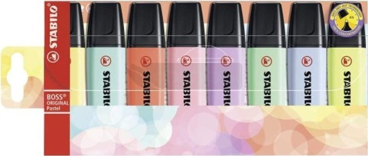 STABILO BOSS ORIGINAL Pastel - prawdziwy klasyk wśród zakreślaczy i niedościgniony wzór! Dostępny jest w 9 kolorach neonowych a także w 10 kolorach pastelowych. Razem aż 19 możliwości do wyboru. Grubość linii od 2 do 5 mm pozwala na zakreślanie tekstów o różnej wielkości. Nadaje się też do pisania, ozdabiania, hand letteringu. Technologia Anti-dry zabezpiecza tusz przed zasychaniem, dzięki czemu można go używać nawet przez 4 godziny i mieć pewność, że nie zaschnie. W trosce o środowisko wszystkie czarne elementy zakreślacza wykonane są z plastiku pochodzącego z recyklingu. Plastikowe etui zawierające 8 szt. zakreslaczy w kolorach pastelowych: turkus, zieleń, róż, lila, żółty, pomarańczowy, czerwony, limonkowy.