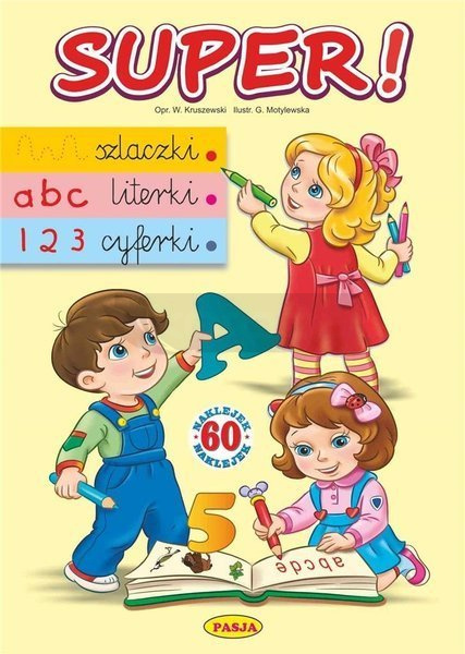 Książka edukacyjna do nauki pisania literek, cyferek i szlaczków. Kolorowanie. Objętość 60 str. + 2 str. naklejek na papierze samoprzylepnym.