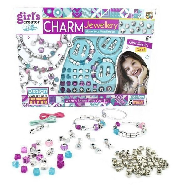 Kreatywny zestaw, w prosty i przyjemny sposób stworzymy unikalną i kolorową bransoletkę. Wiele możliwości tworzenia kreatywnych zestawów. Zestaw składa się z bransoletki oraz unikalnych koralików z różnymi motywami. W zestawie mamy trzy bransoletki oraz dwa naszyjniki, więc każdą z nich można nosić na inną okazje lub obdarować bliskie osoby. Zabawka rozwija wyobraźnię i kreatywność. Zestaw do samodzielnego wykonywania biżuterii, kolorowe koraliki w różnych kształtach i kolorach. Tworzymy naszyjniki, bransoletki w unikalne wzory i połączenia.