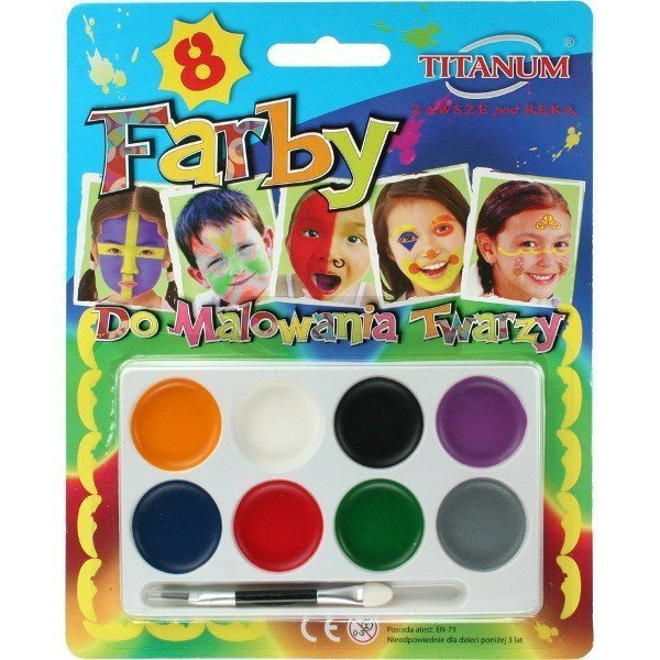 Zestaw zawiera farbki do twarzy w 8 kolorach i podwójny aplikator.