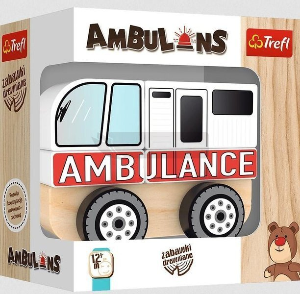 Zabawka Ambulans z serii Zabawki Drewniane wzmacnia odruch chwytania i uczy precyzji. Zabawka pobudza wyobraźnię i rozwija koordynację wzrokowo-ruchową. Posiada ruchome elementy. Wszystkie materiały wykorzystane do stworzenia zabawki posiadają atesty, a także zostały pomalowane nietoksycznymi farbami.