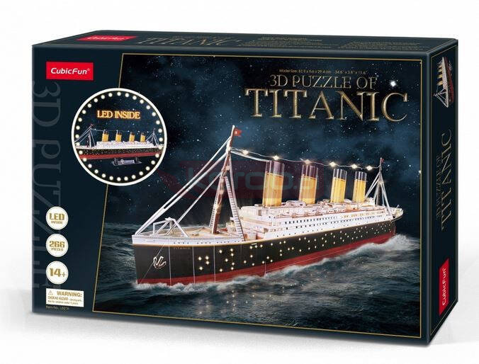 Titanic LED to nowy model puzzli 3D z podświetlanym kadłubem. Statek składa się z 246 elementów i osiąga po złożeniu wymiary 87,9 x 9,6 x 29,4 cm. Do montażu nie jest wymagany klej, nożyczki ani inne specjalne narzędzia. Wszystkie puzzle są ponumerowane i ponacinane, a sposób ich układania jest pokazany w instrukcji. Po złożeniu puzzle mają wysoką wartość edukacyjną i świetnie prezentują się jako dodatek.